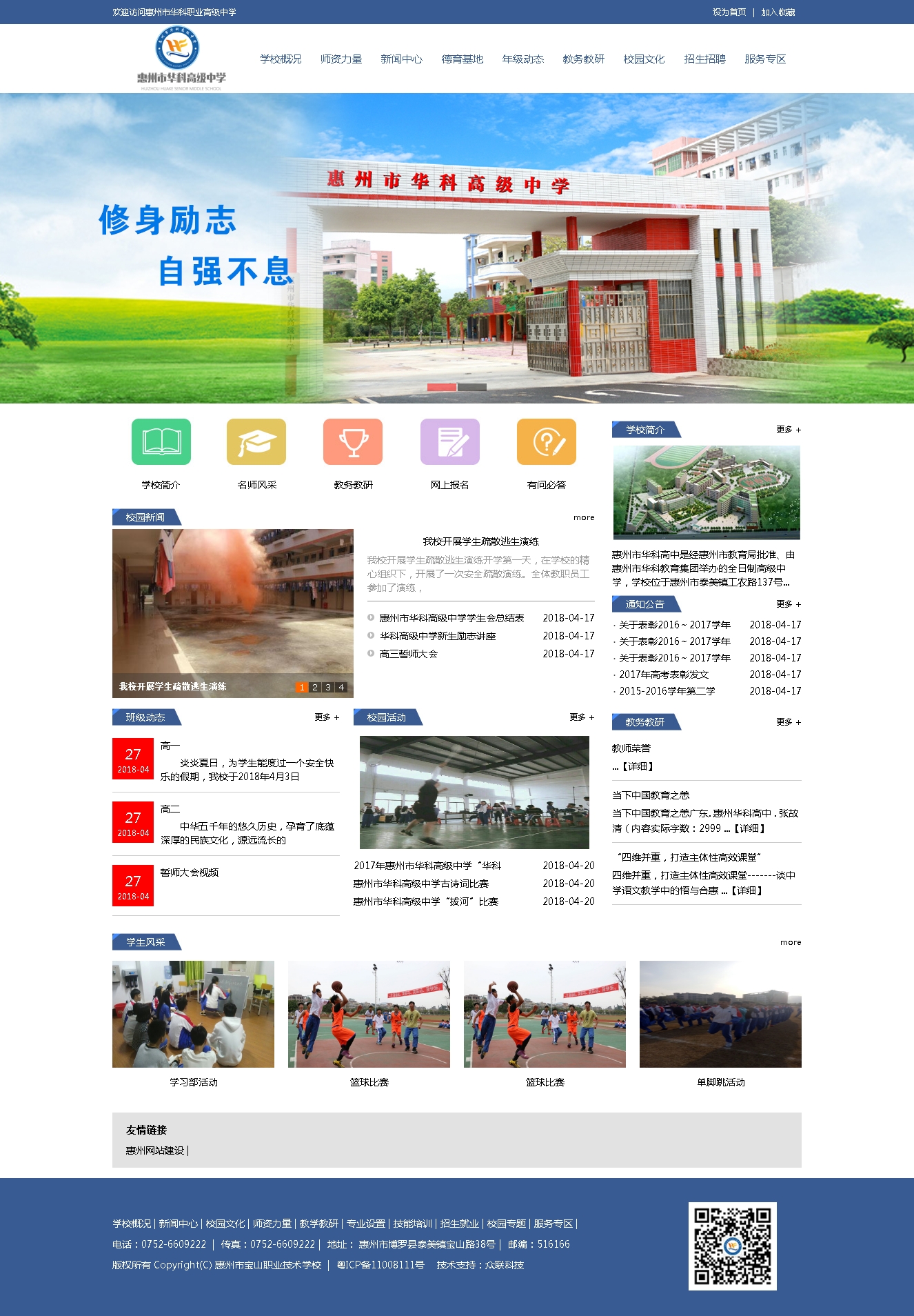 惠州市华科高中是经惠州市教育局批准、由惠州市华科教育集团举办的全日制高级中学,学校位于惠州市泰美镇工农路137号,占地面积60多亩,教学设备先进,生活设施完善,校园环境优雅,是理想的读书求学之地。 学校秉承“修身励志,自强不息”的校训精神,以创建一流高中为办学目标,以“人文引领,个性发展,学有所长”的办学理念,注重德育工作,实施素质教育,开展成功教育,培养学生养成良好的学习习惯和奋发向上的自信心,为学生健康成长创造良好气氛。